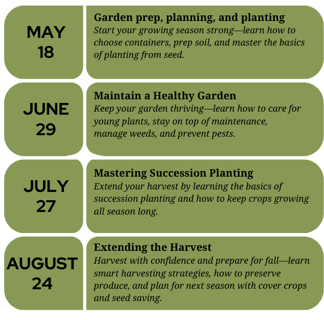 Join us for a start to finish gardening journey—whether you want to grow your own food or simply create a thriving outdoor space, you’re sure to learn a thing or two.